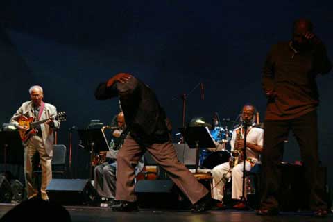 Then it was the time for the elder to assert himself. Rising to his feet again, Ernest Ranglin began picking out the notes to “Surfin’.” Originally recorded for Clement Dodd at Studio 1, this arrangement was closer to the one on his revival hit CD, “Below The Baseline.” The melody was given a vigorous reading by Ranglin’s fluid fingers, which slid rapidly over the frets.